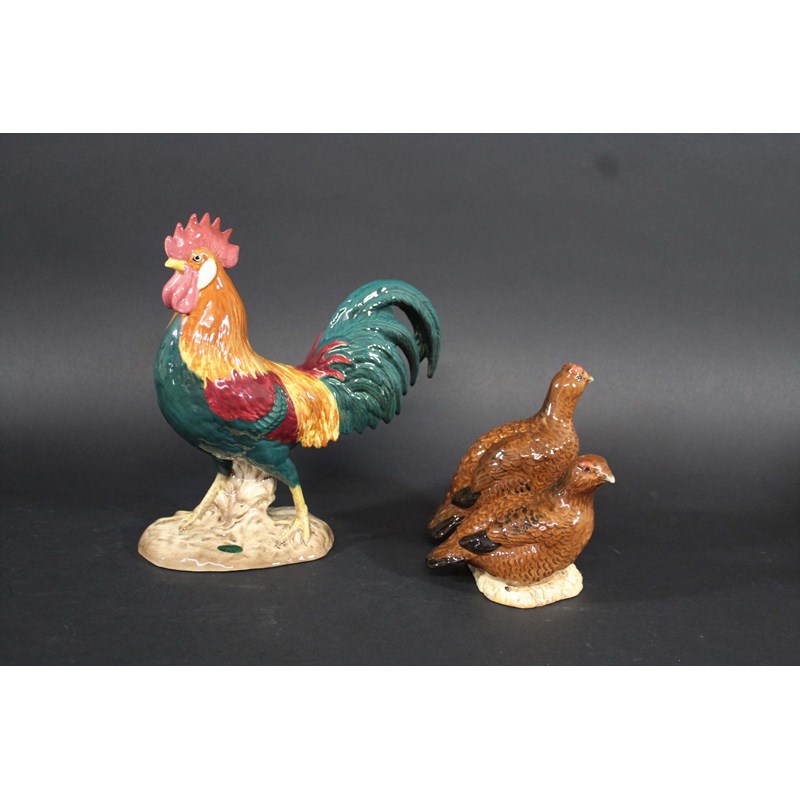 including Model 1892 Leghorn Cockerel, designed by Arthur Gredington and issued from 1963-1983. Also with a Beswick Pair of Grouse, Model 2063, designed by Albert Hallam and issued from 1966-1975. Cockerel 9 1/2ins (24cms) high. (2)