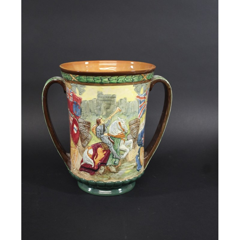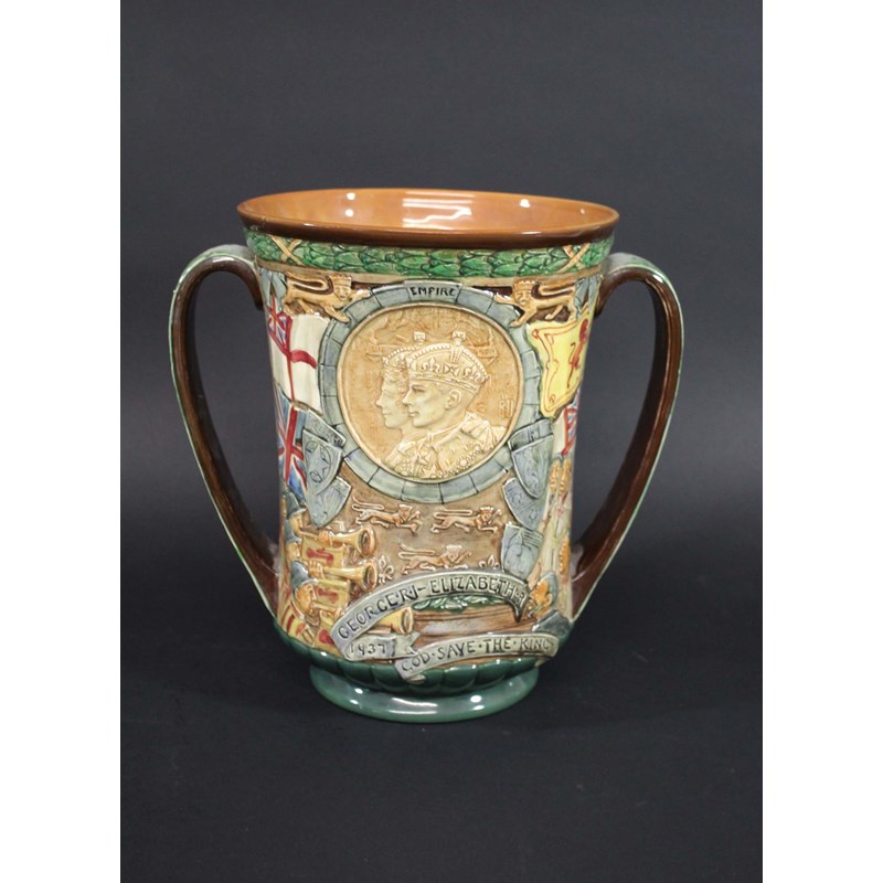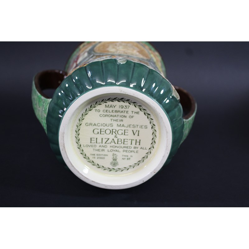a large two handled loving cup, made to commemorate the Coronation of King George VI and Elizabeth in 1937. With a portrait panel on one side and a Knight on the reverse, the handles with Commonwealth Countries, signed Noke and Fenton. Marked, Royal Doulton, No 97 of 2000. 10 1/4ins (26.5cms) high