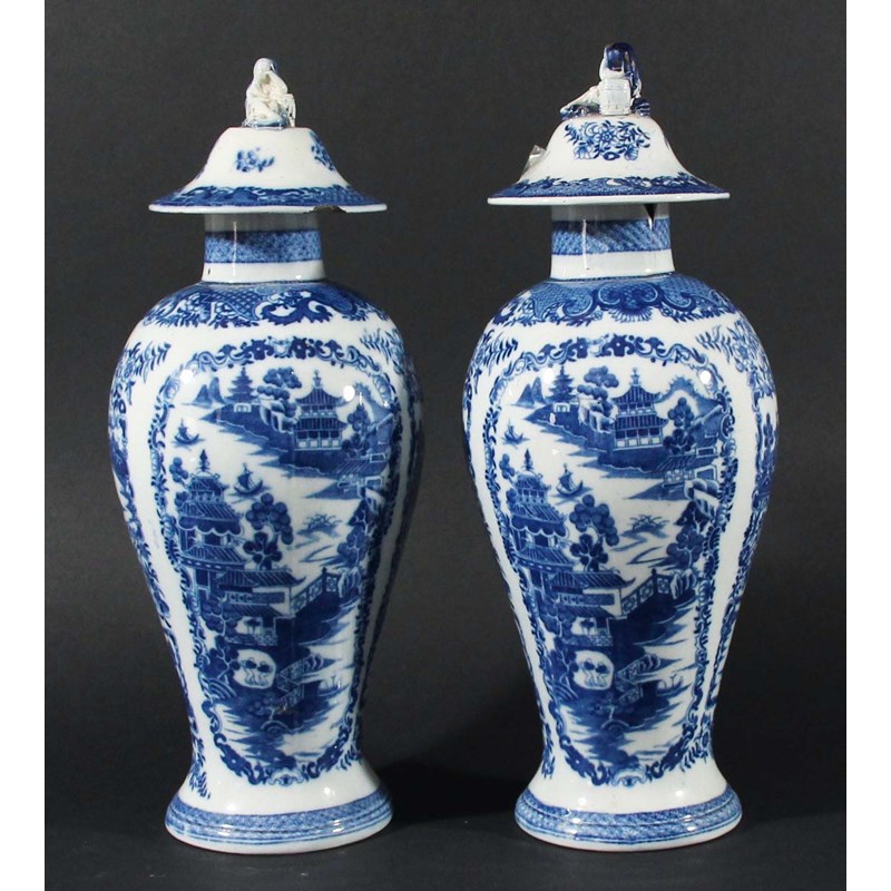 circa 1830, of inverted baluster form, blue transfer printed with chinoiserie scenes, the covers with widow finials, height 30cm (4)