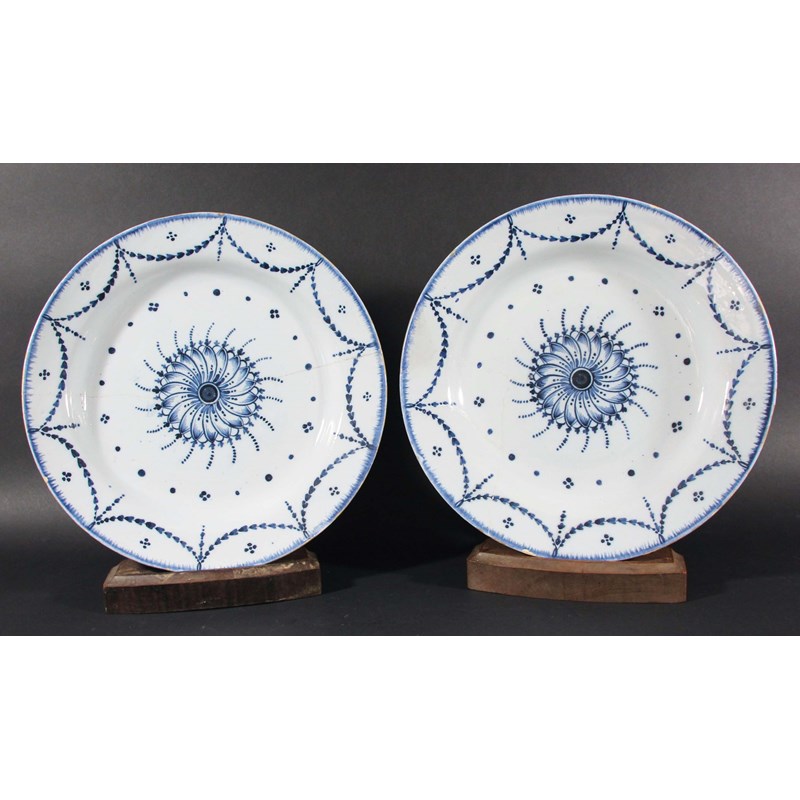 later 18th century, probably English, blue painted with a central flowerhead inside a harebell swag border and feathered rim, 33.5cm (2)