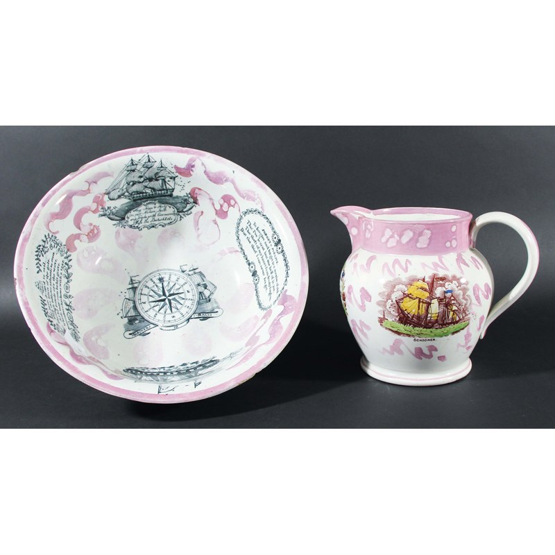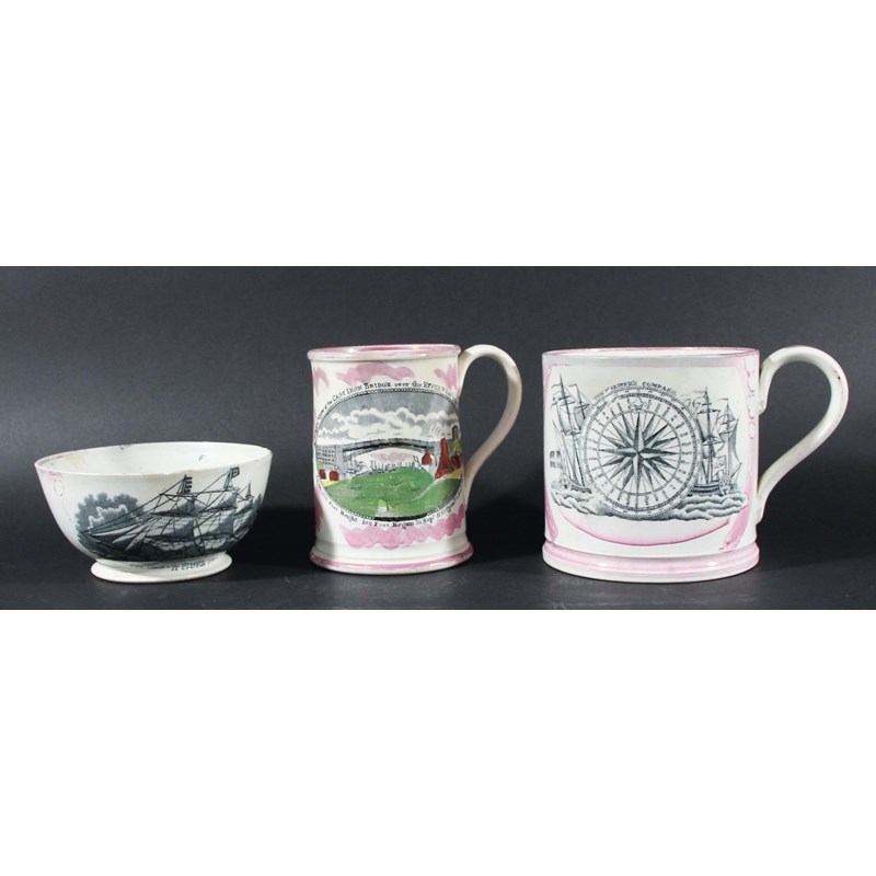 to include a bowl with a print of Garibaldi to the interior, a Bridge of the River Wear frog mug, a Sailor's Farewell jug, a Mariner's Compass tankard and Forgive and Forget wash bowl (5)