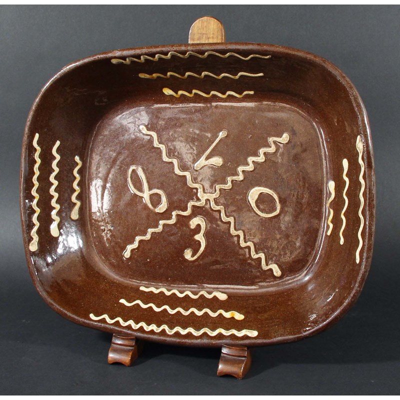 ENGLISH SLIPWARE DISH, dated 1830 in cream slip beneath wavy decoration to the rim, length 35.5cm