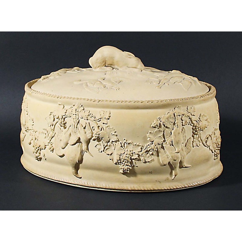 WEDGWOOD CANE WARE GAME TUREEN, COVER AND LINER, with various game and fruiting vine relief decoration, impressed marks, length 35cm (3)