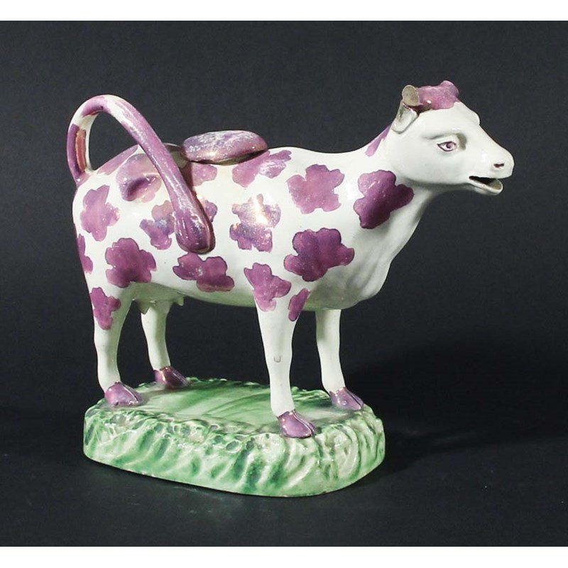 PEARLWARE COW CREAMER AND COVER, circa 1800, standing four square on an oval base, with Sunderland lustre patches, length 18cm (2)