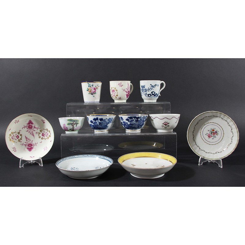 late 18th century, to include a Lowestoft blue and white coffee cup, Worcester coffee cup and saucer with puce and gilt decoration, Liverpool blue and white saucer and coffee can, either Chaffers or Christian, Derby cup and others (11)