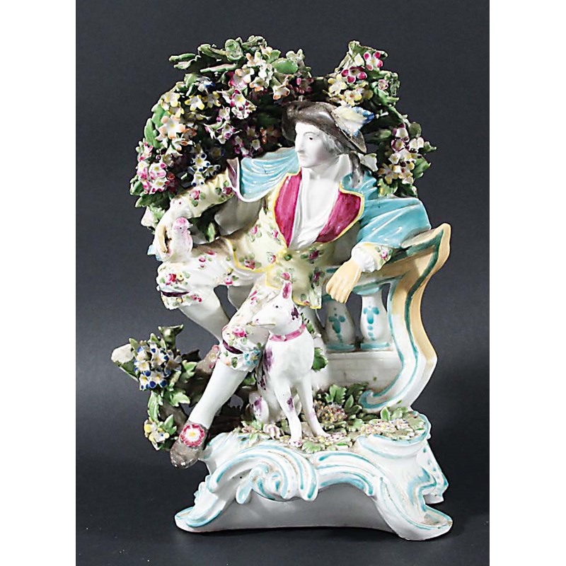circa 1765-70, the man resting on a balustrade a bird on his knee and a dog at his feet, on a scrolling base, patch marks, height 25cm