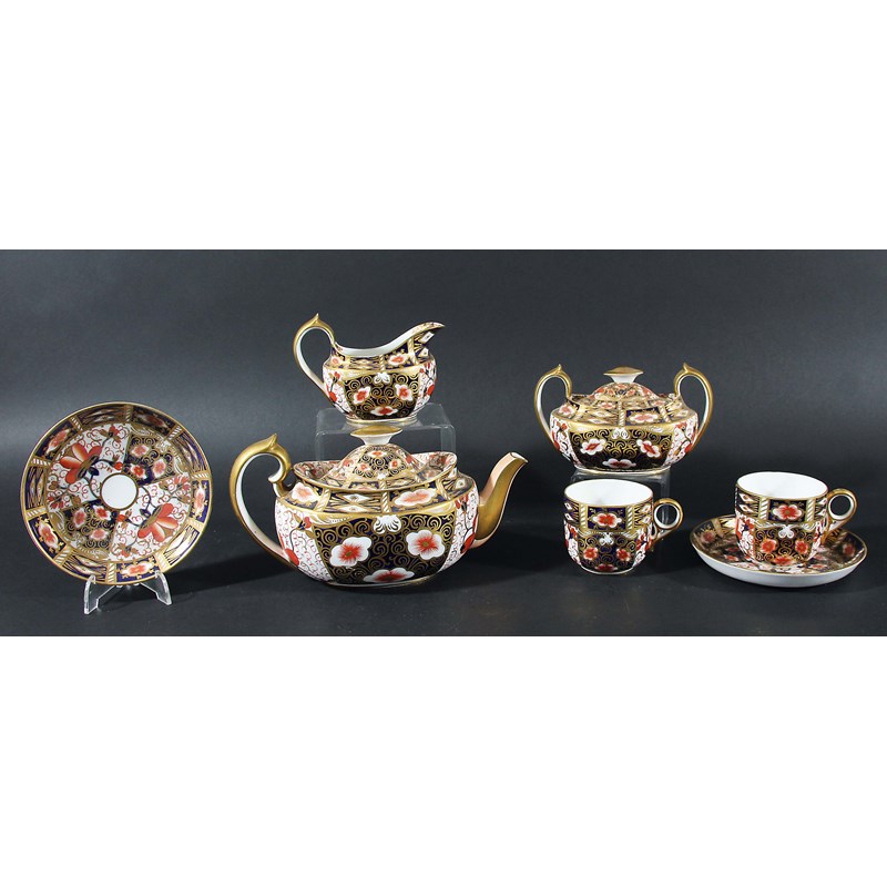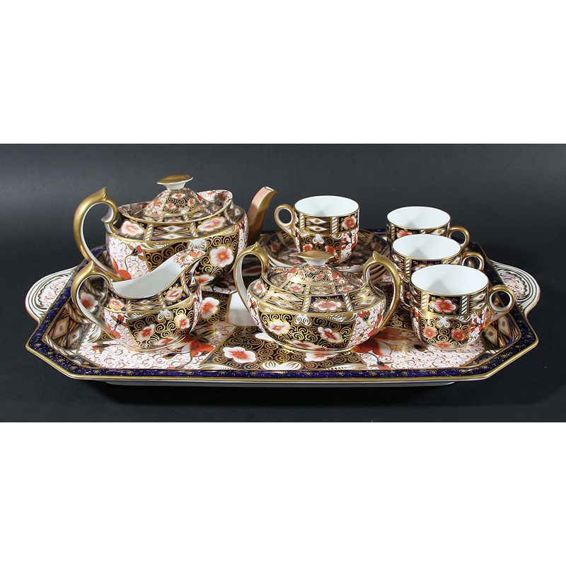 ROYAL CROWN DERBY TEA SET, 1893-1895, in Imari pattern 2451, comprising a tray, teapot and cover, sucrier and cover, milk jug, four cups and saucers, puce and iron red marks, length of tray 48.5cm (14)