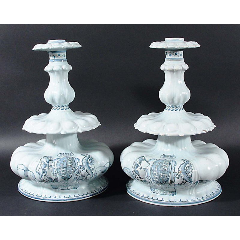 PAIR OF CANTAGALLI MAIOLICA CANDLESTICKS, 20th century, of foliate, lobed, middle eastern form, blue painted with the arms of Lord Somerset, Duke of Beaufort, height 31cm (2)