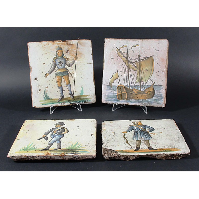 FOUR FAIENCE TILES, 19th century, probably French, including figures and a sailing boat, each 20cm x 20cm approx (4)