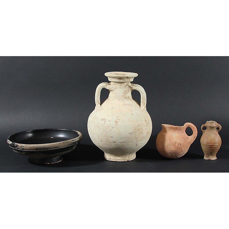 ANTIQUITIES: a collection of pottery to include a blackware bowl, two 2 handled vases and a drinking cup, height of larger vase 21cm (4)