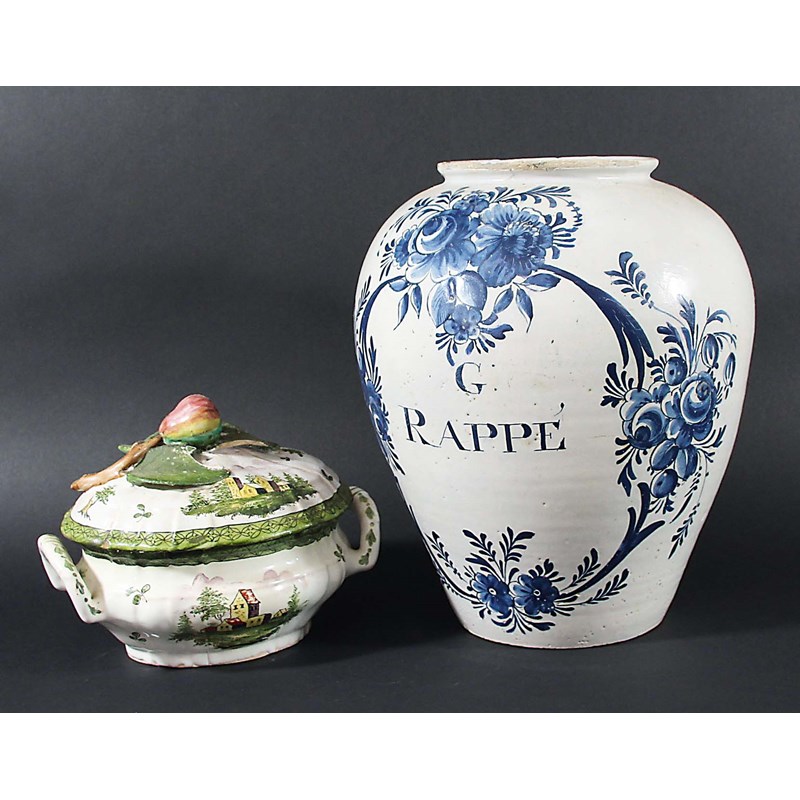 18th century, inscribed 'G. RAPPE' inside a floral cartouche, blue painted mark for De 3 Klokken manufactury, height 30cm; together with a faience tureen and cover, painted with buildings and with a fruit finial, painted marks, length 21cm (3)