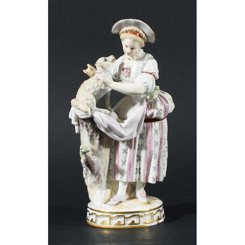 MEISSEN FIGURE OF A SHEPHERDESS, 19th century, a lamb seated on a tree stump, blue crossed sword and incised marks, height 18cm