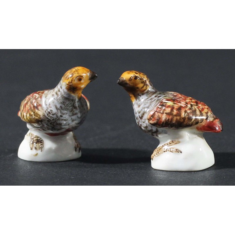 PAIR OF MEISSEN MINIATURE BLEEDING HEART PARTRIDGES, standing facing to the left, blue crossed sword and impressed numbers, height 2.5cm (2)
