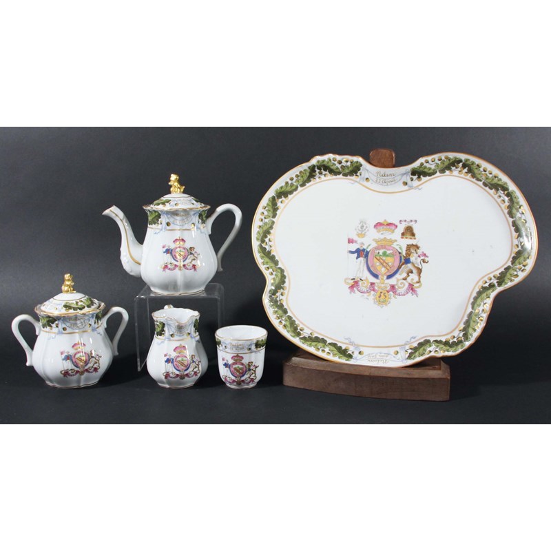 late 19th or 20th century, painted with a crest beneath the gilt inscriptions 'Nelson 22 April' and 'Nelson San Josef', comprising teapot and cover, sucrier and cover, cup, jug and tray, tray width 34cm (7)