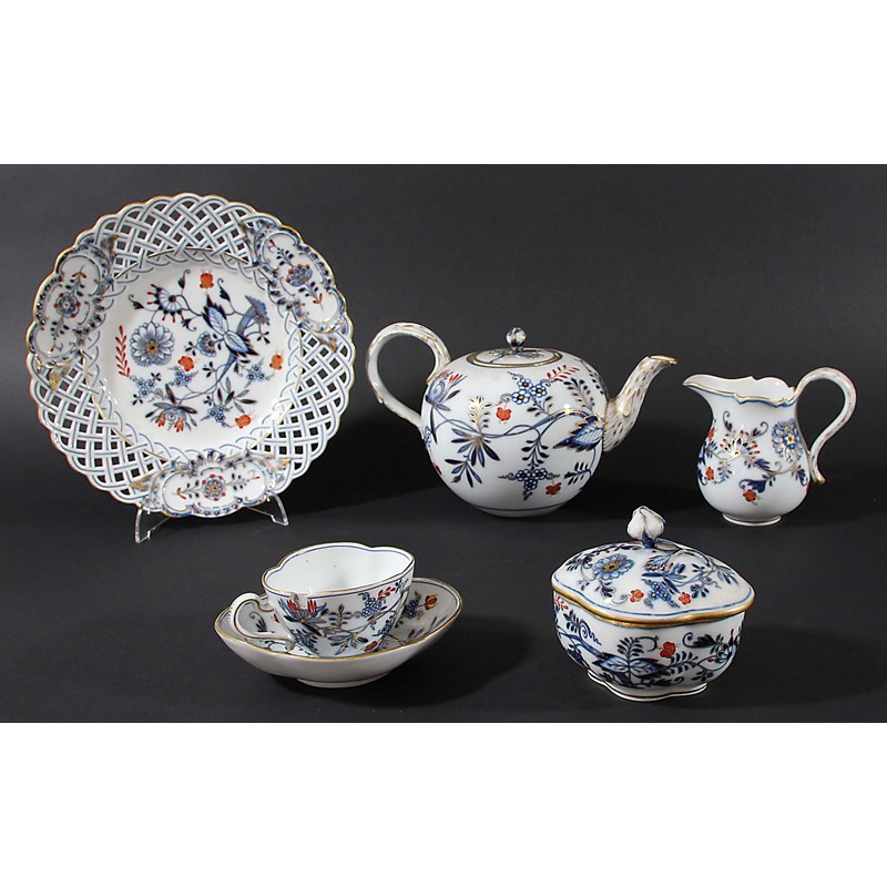 later 19th century, decorated with a scrolling floral design in the imari palette, comprising a teapot and cover, sucrier and cover, milk jug, four quatrefoil cups and saucer and a plate with a pierced border, blue crossed sword and impressed marks (14)