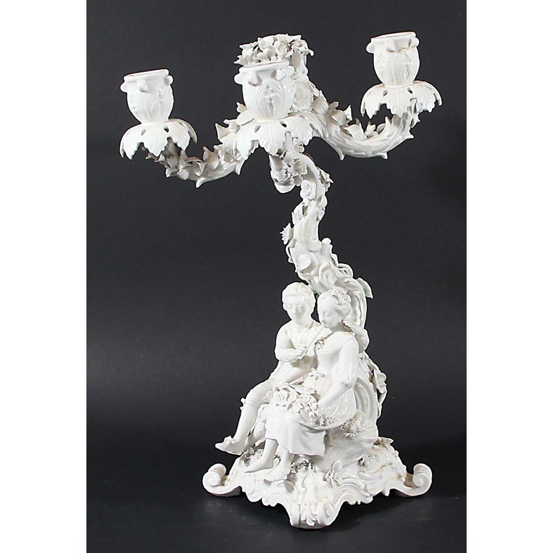 MEISSEN MARCOLINI CANDELABRA, circa 1800, in white, modelled as a courting couple beneath the four scrolling lights, blue crossed sword mark, height 37cm