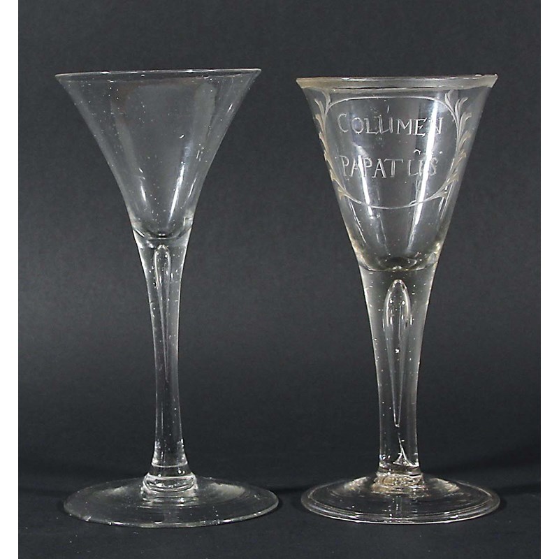 circa 1750, probably Dutch, of drawn trumpet form engraved Columen Papatus on a tear drop stem and folded over foot, height 19cm; together with another, similar, on a spreading foot, height 19cm (2)