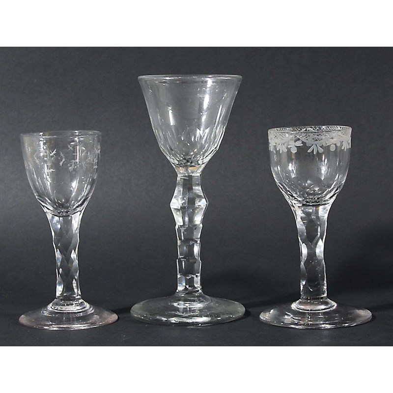 circa 1770, the ogee bowl with faceted base on a facetted, knopped stem and spreading foot, height 15.5cm; together with two further each with engraved bowls and facetted stems (3)