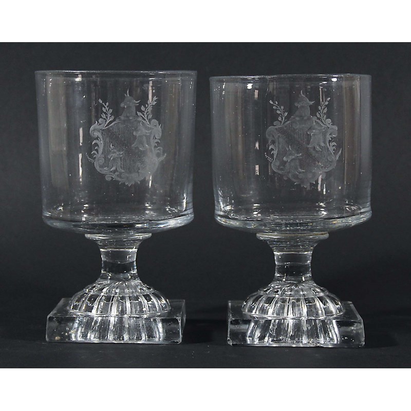 circa 1800, the bucket bowls engraved with a coat of arms of three bull's heads, on a short stem and lemon squeezer foot, height 15cm (2)