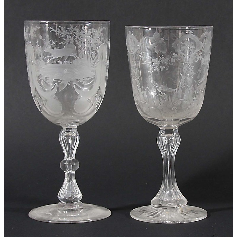ENGRAVED GLASS GOBLET, 19th century, with deer hunting scenes between swags, height 19cm; together with another, similar, engraved with birds, insects and swags, height 18.5cm (2)