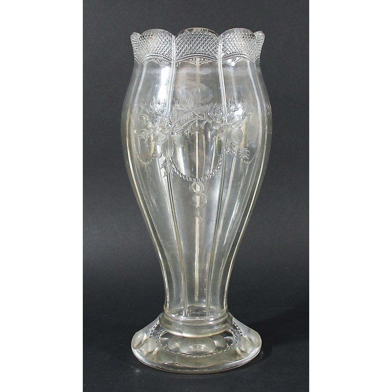 the wavy rim with strawberry cutting above roundels framed by engraved roses and ribbons, the faceted foot with a ring of engraved roundels around the ground out pontil, height 31cm