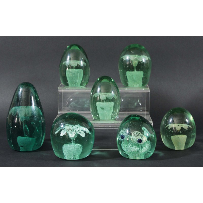 COLLECTION OF SEVEN VICTORIAN GREEN GLASS DUMPS, with floral decoration, height 8cm to 14cm (7)