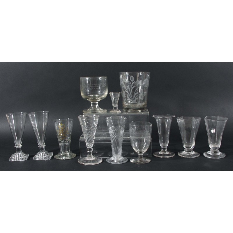 COLLECTION OF GLASSES, 18th and 19th century, to include a rummer with flower and insect engraving, ale glasses, rummers and others (12)