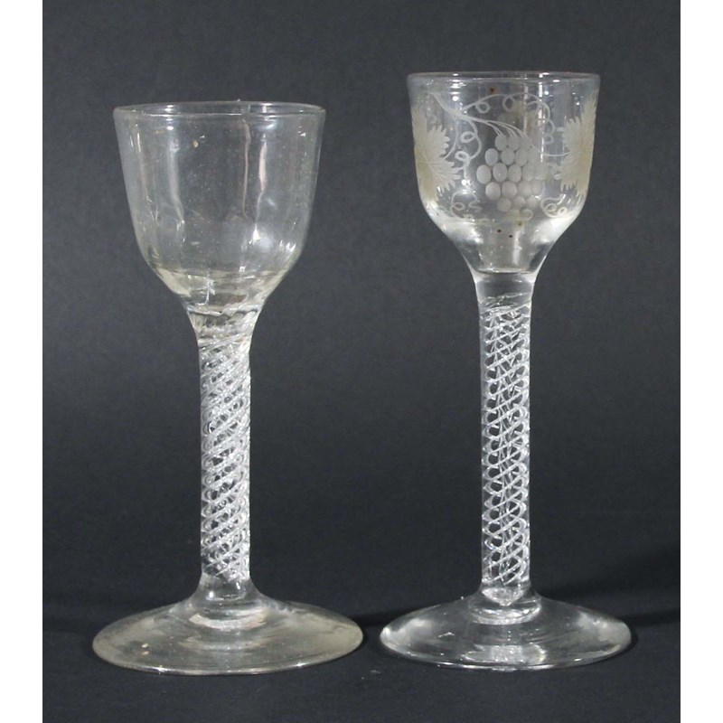 circa 1750, the ogee bowl engraved with fruiting vines on a stem with a central cable inside four spirals, height 15cm; together with another with an ogee bowl with moulded fluting on a stem with a central cable inside four spirals on a spreading foot, height 14.5cm (2)