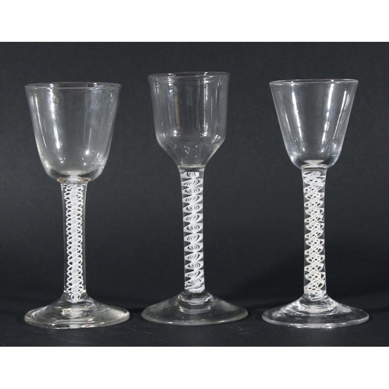 circa 1780, each with a plain bowl, the first with a gauze inside four spirals, the second with a helix inside a multi-stand twist and the third with a multi-strand double helix, height 15cm (3)