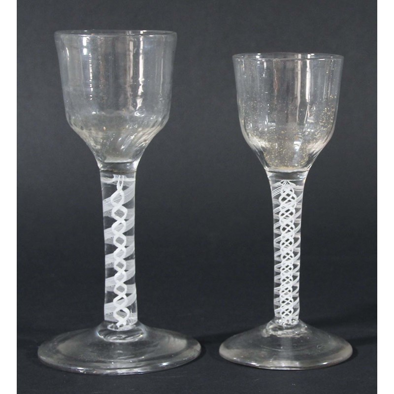 mid/late 18th century, the ogee bowl with moulded wrythen fluting on a stem with a double helix inside a white enamel fourteen strand single helix and spreading foot, height 14.5cm; together with another, similar, the bowl with moulded fluting, the stem with a white enamel four strand helix inside a four strand double helix, height 13.5cm (2)