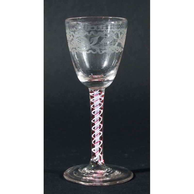 CONTINENTAL WINE OR CORDIAL GLASS, the wheel engraved bowl on a stem with a central gauze inside a red and white enamel helix and spreading foot, height 12.5cm Provenance: bought Lawrences, 16th January 2014, lot 1273