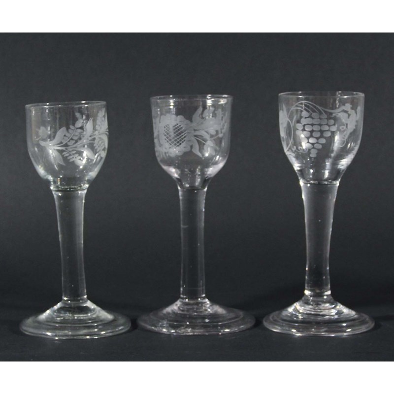 late 18th century, the rounded or ogee bowls engraved with a bird and foliage, one with fruiting vines, on plain stems and folded feet, heights 13.5cm and smaller (3)