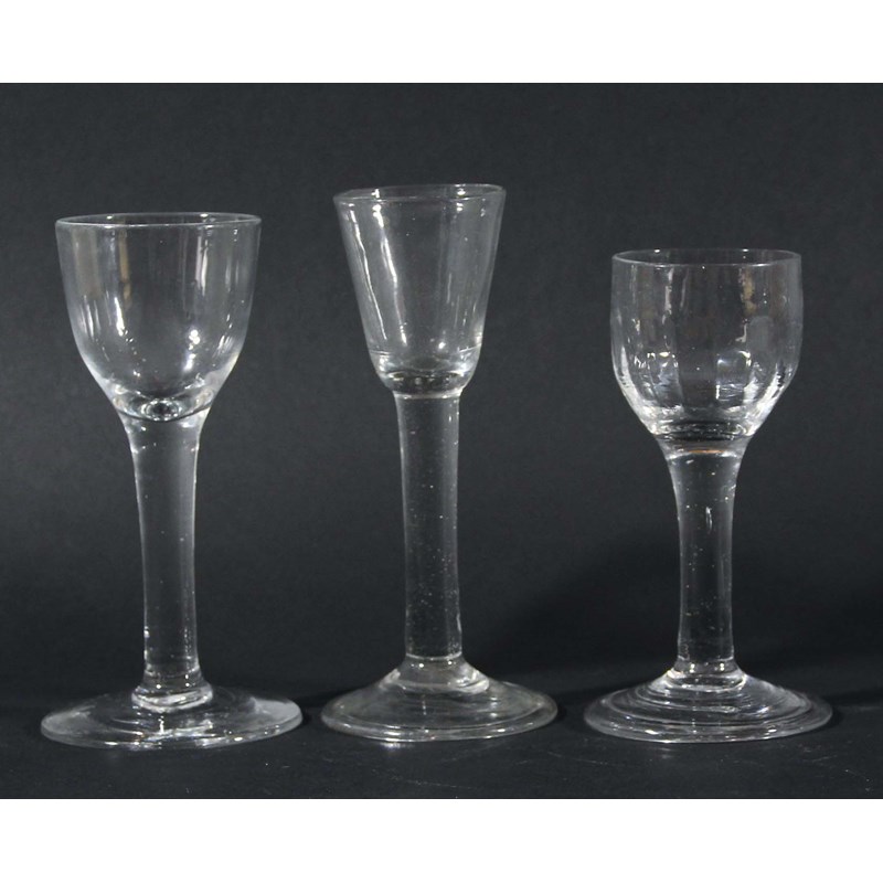 circa 1780, the ovoid bowl with moulded flutes, plain stem and folded foot, height 12.5cm; together with another with ovoid bowl, plain stem and spreading foot, height 14cm; and a cordial glass with plain stem and folded foot, height 14cm (3)