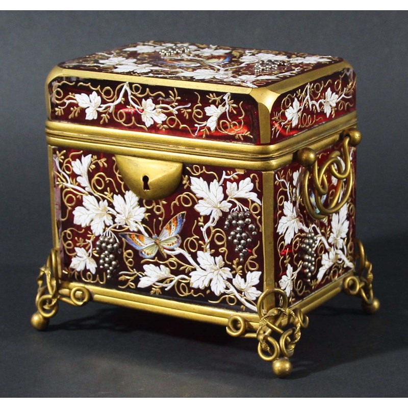 MOSER CRANBERRY GLASS AND GILT METAL CASKET, late 19th century, enamelled with butterflies amongst fruiting vines, the grapes of applied metal, with key, height 12cm, width 12.5cm, depth 9.5cm