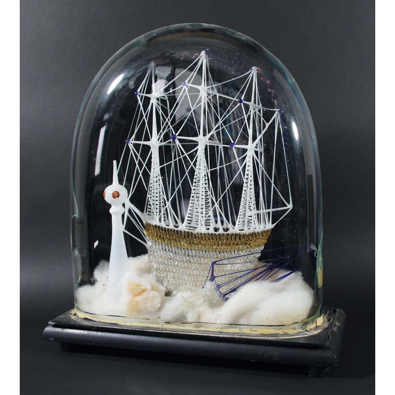 VICTORIAN GLASS FRIGGER, of a three masted sailing ship with a pilot boat and light house beside, under a glass dome with a painted background, height excluding dome 36cm