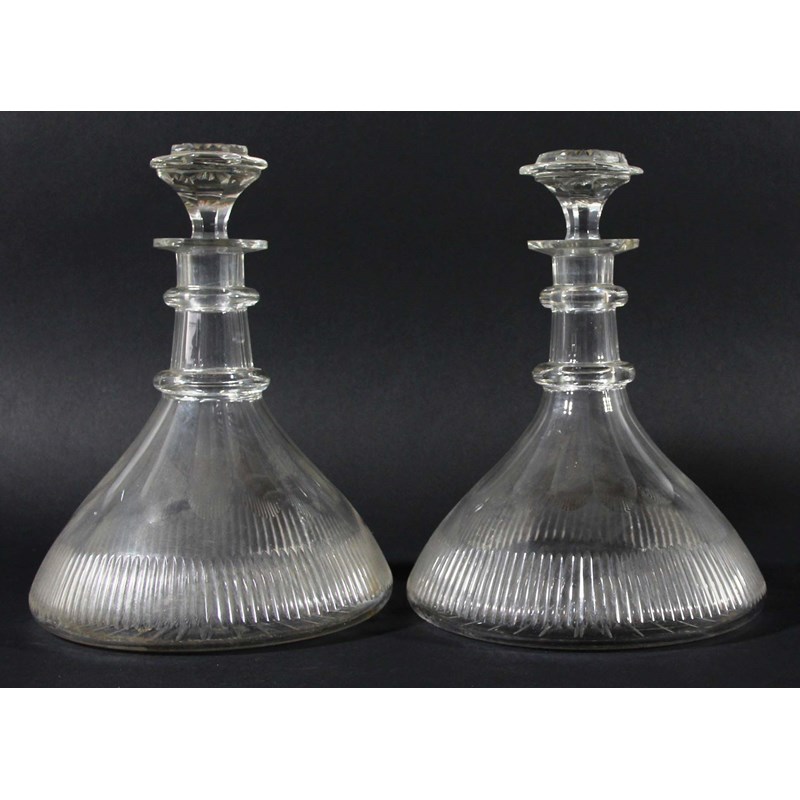 PAIR OF REGENCY GLASS SHIP'S DECANTERS AND STOPPERS, with a two ring and faceted neck, star cut base and octagonal stopper, height 23cm (4)