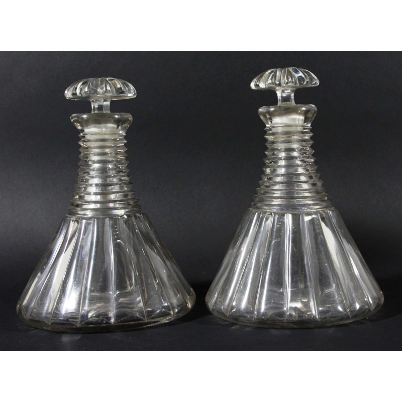 PAIR OF REGENCY GLASS SHIP'S DECANTERS AND STOPPERS, with a ring cut neck, ribbed body and flowerhead stopper, height 24cm (4)