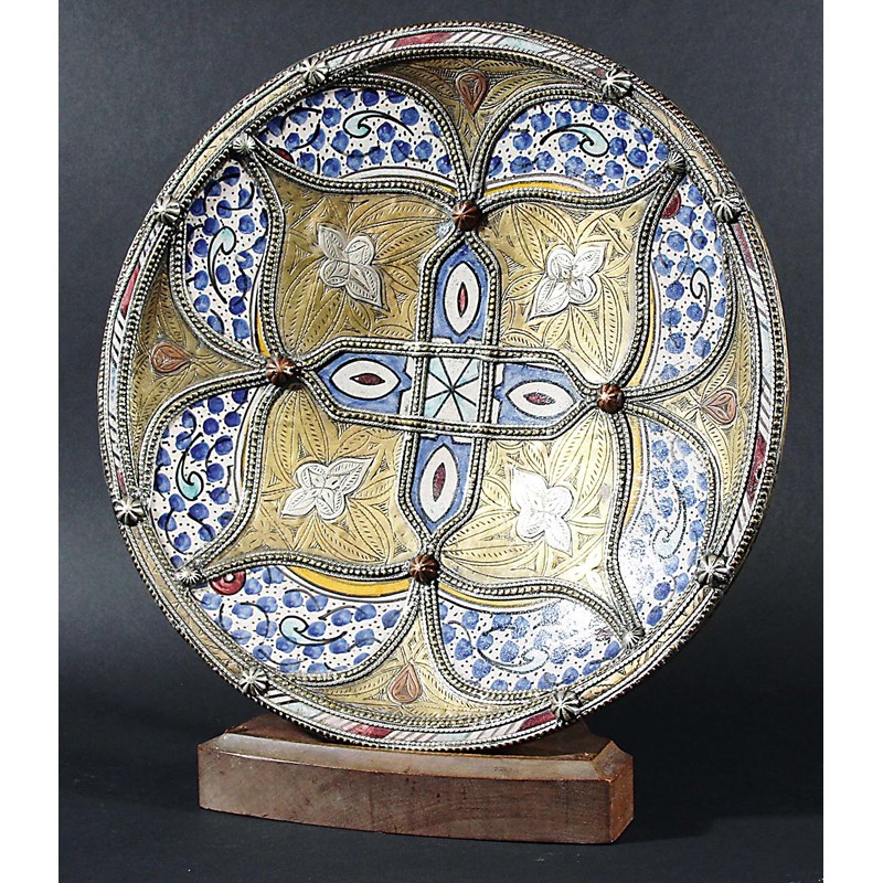 PERSIAN STONEWARE DISH, 17th century style, painted with stylised floral patterns with copper, brass and white metal mounts, diameter 32.5cm