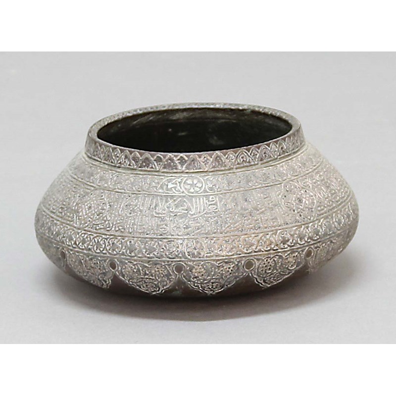 BIDRI WARE BOWL OR SHORT VASE, 19th century, with panels of inscriptions between bands of decoration, diameter 21cm