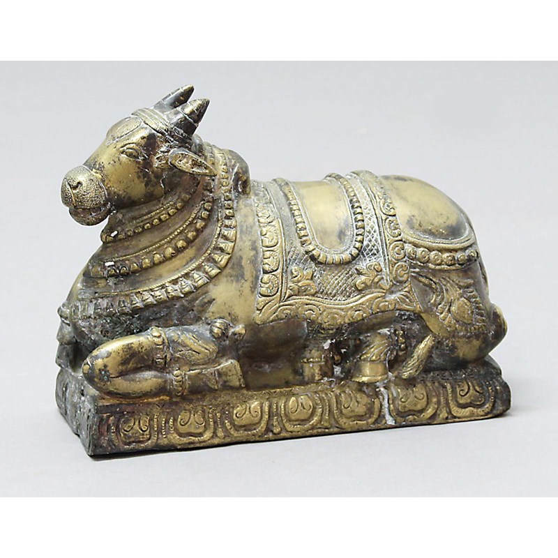 INDIAN BRASS NANDI BULL, modelled recumbent on a rectangular base, length 30cm