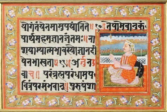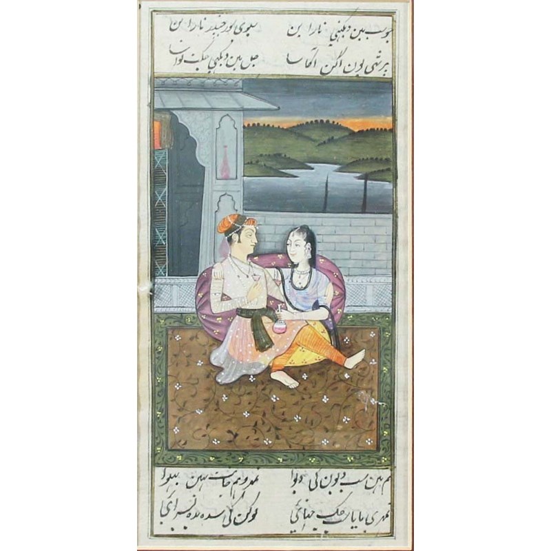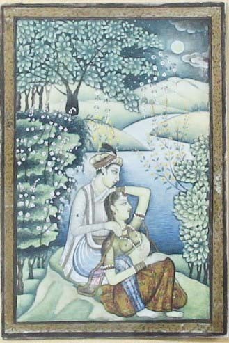 GROUP OF FOUR INDIAN MINAITURES, to include an illuminated page with a man seated on a terrace, a circular scene of a deer hunt and two of lovers, probably Radha and Krishna (4)