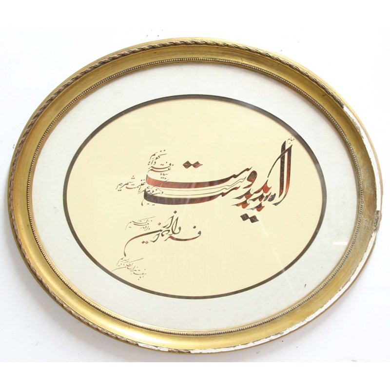 an Arabic inscription in ink with gilt highlights, oval, 36cm x 45cm