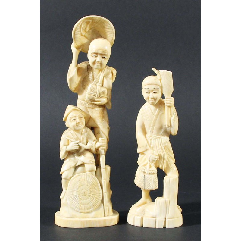 TWO JAPANESE IVORY OKIMONO, Meiji, the first of two travellers, the second of a single man, both with two character signature, heights 19 and 14cm (2)