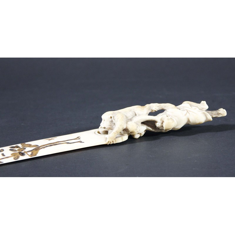 JAPANESE IVORY PAGE TURNED, mid-late 19th century, the handle carved as three monkeys, the blade with shibayama style floral and butterfly decoration, length 37cm