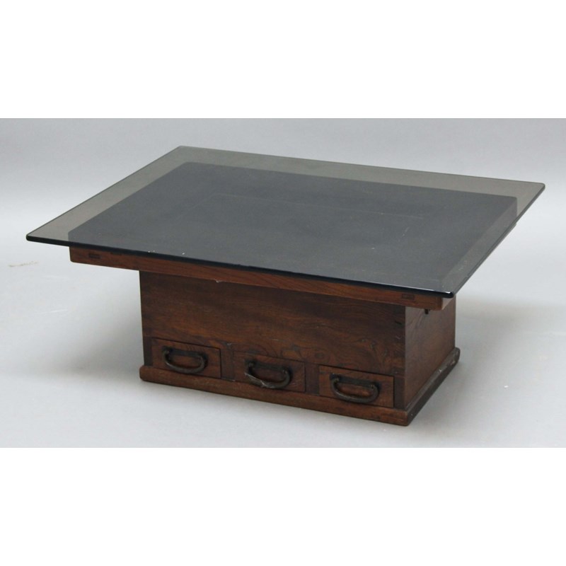 JAPANESE ELM HIBACHI, the rectangular top above the base with brass burner/liner and three drawers, with a smoked glass top, height 34cm, width 77cm, depth 52cm