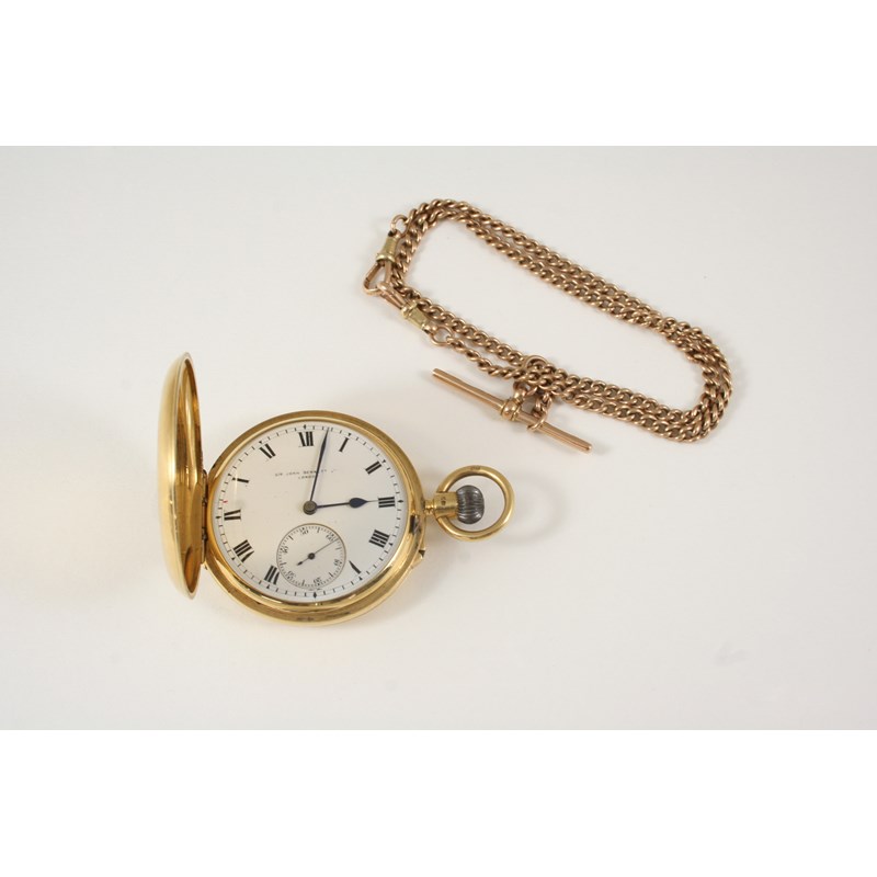 the signed white enamel dial with Roman numerals and subsidiary seconds dial, 50mm. dia., 88.4 grams, together with a 9ct. gold watch chain, suspending a 9ct. gold 't' bar, 40cm. long, 22.3 grams.