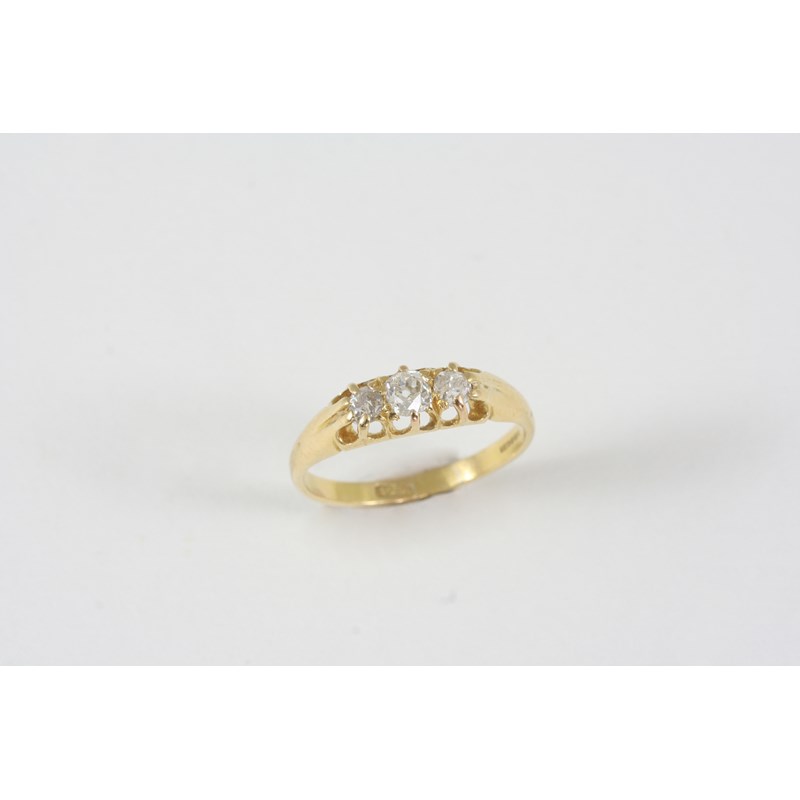A DIAMOND THREE STONE RING set with three graduated old brilliant-cut diamonds, in 18ct. gold. Size P 1/2.