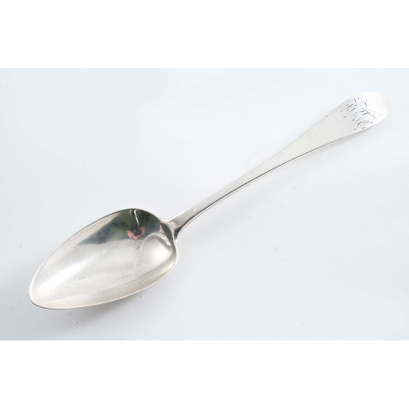 A GEORGE III IRISH PROVINCIAL TABLE SPOON with a Celtic point, initialled, by John Toleken, Cork (TOLEKEN,STERLING) c.1800; 2.2 oz