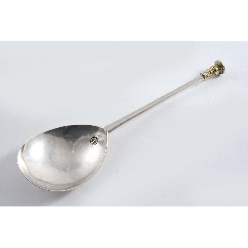 with a gilt terminal & a crest on the back of the bowl, maker's mark only struck once in the bowl, by John Ivie, Salisbury 1620-30; 6.5" (16.5 cms) long; 1.15 oz