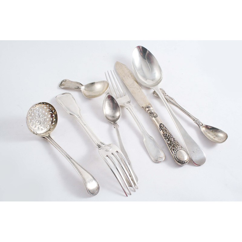 Hourglass pattern, partly marked, Dublin 1825-30, a Victorian Bead pattern sugar sifter ladle, two forks, a table spoon, a knife & two small spoons, some initialled, some crested; the caddy spoon 3.4" (8.5 cms) long; 12.9 oz (8)
